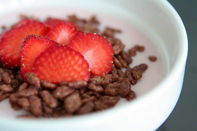 Sundays are spent with my folks and siblings over lunch and sometimes, all the way down to merienda. I always make it a point to eat light for breakfast so that I have "space" for my mom's cooking. The Young Tongue and I shared this for breakfast: cherry yogurt, milk, choclate rice krispies, and slices of strawberries. Mmmm...I wonder what's for lunch today?